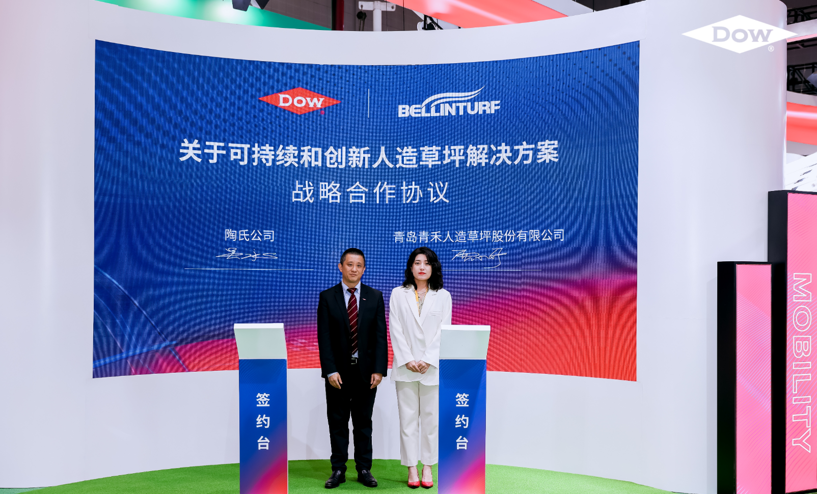 中国上海,2025年 11月6日——全球领先的材料科学公司陶氏公司(纽交所代码:DOW)与青岛青禾人造草坪股份有限公司(以下简称“青岛青禾”)在第八届中国国际进口博览会举行期间签署战略合作备忘录。此次合作聚焦于可持续的包装树脂(包括生物基、机械回收及化学回收聚乙烯PE)的采购与应用,双方将整合各自优势资源,协力拓展可持续包装树脂的应用领域,推动循环经济的发展。